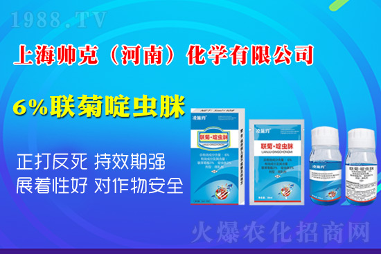 藥劑可使用上海帥克(河南)化學(xué)有限公司【6%聯(lián)菊·啶蟲脒-凌施約】本品采用萃取濃縮技術(shù),超高活性、滲透;對刺吸式[器害蟲形成立體全面攻擊,藥液具有展著功能,能迅速滲入植物幼芽、葉縫毛縫間隙,對隱蔽性極強的薊馬、蚜蟲、白粉虱、棉盲蝽、椿象等刺吸式C器害蟲能夠鏟除;