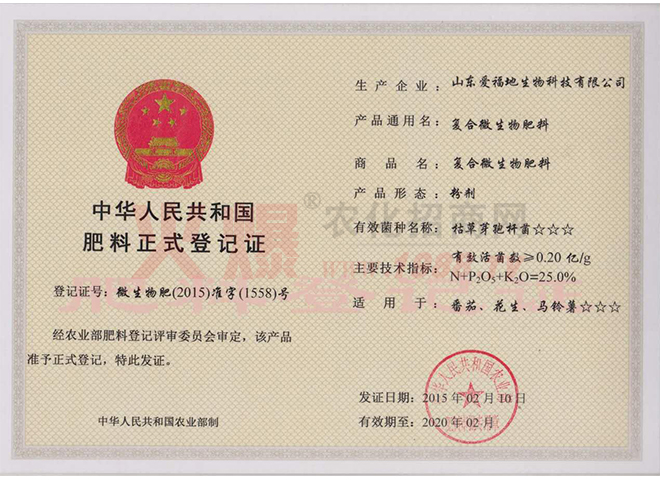 證書名稱:肥料正式登記證 發(fā)證機(jī)構(gòu):中華人民共和國農(nóng)業(yè)部