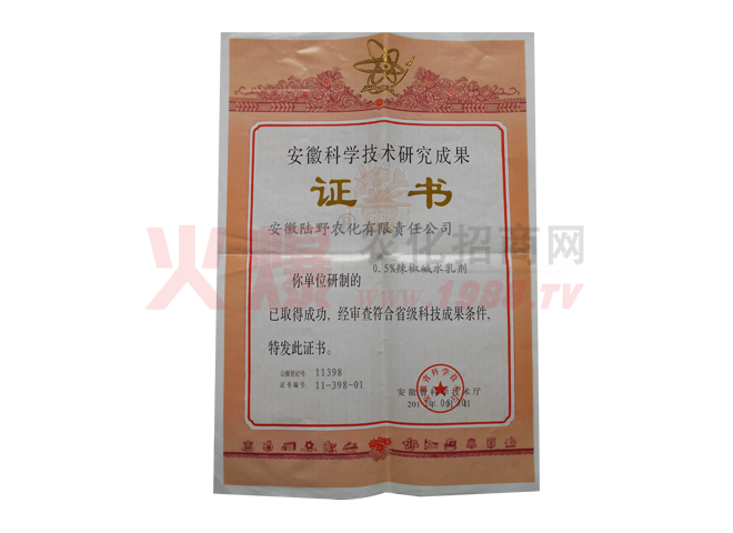 2009年以來我公司自主研發(fā)4.5%高效氯氰菊酯水乳劑工藝及技術(shù)、0.5%辣椒堿水乳劑分別獲得安徽省科學技術(shù)成果證書;