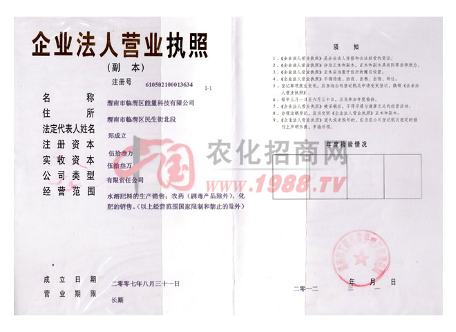 陜西渭南能量科技有限公司,是一家大中型科研、生產(chǎn)、經(jīng)營(yíng)綜合性液體肥企業(yè)。公司擁有一批高的科技專家和技術(shù)骨干力量。并有先進(jìn)型多組合生產(chǎn)線,年生產(chǎn)萬噸以上綠色環(huán)保型沖施肥和葉面肥。