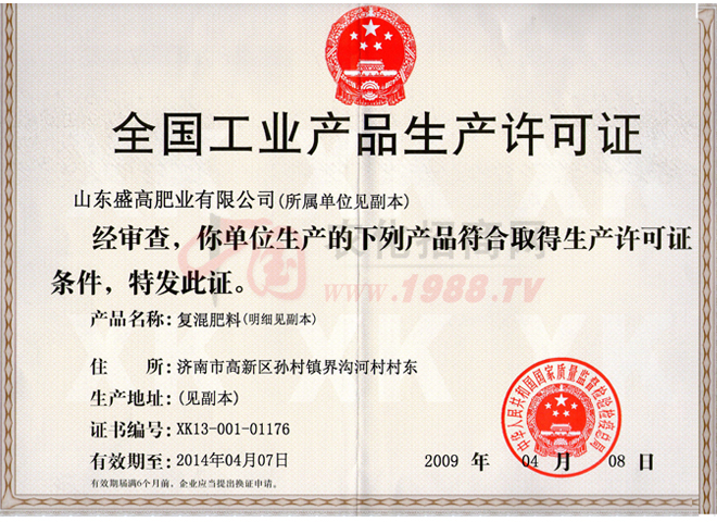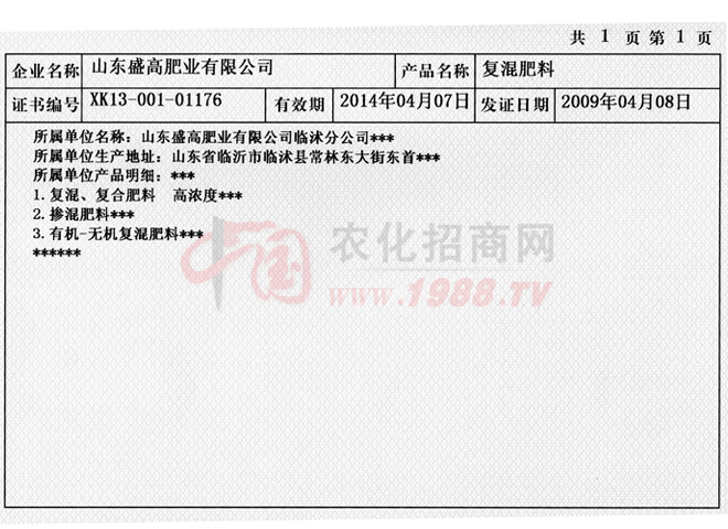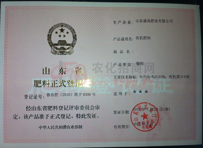 證書名稱:肥料正式登記證 發(fā)證機(jī)構(gòu):山東省農(nóng)業(yè)廳